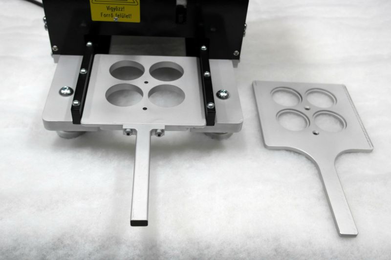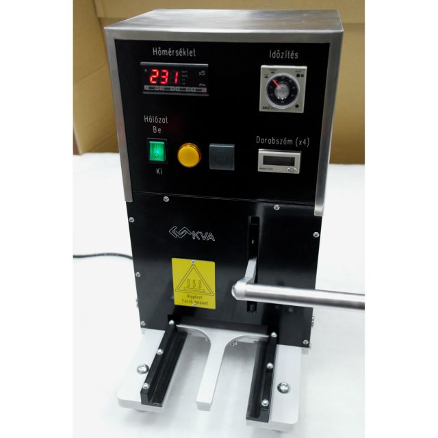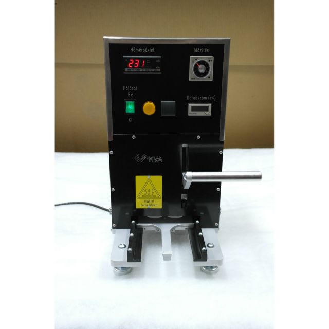 Kézi, zárófólia hegesztő berendezés cserélhető tálcákkal és erőhatárolóval.