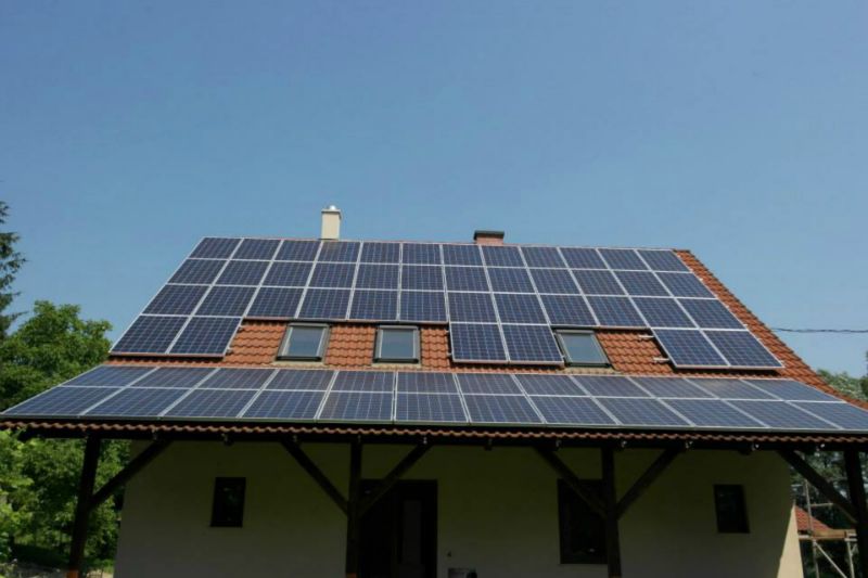 16,5 kWp-es hálózatra visszatápláló napelemes kiserőmű. 66 db Sharp 250 W-os napelem, melyek a családi ház villanyfűtését és az egyéb elektromos berendezések villamos igényét szolgálják ki.